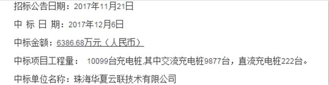 2017年12月6日,新能源市场最大招标项目终于尘埃落定,珠海华夏云联技术有限公司以近七千万投入成功拿下充之鸟EPC工程,投入建设10099台充电桩,其中包括:交流充电桩9877台,直流充电桩222台。