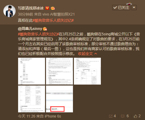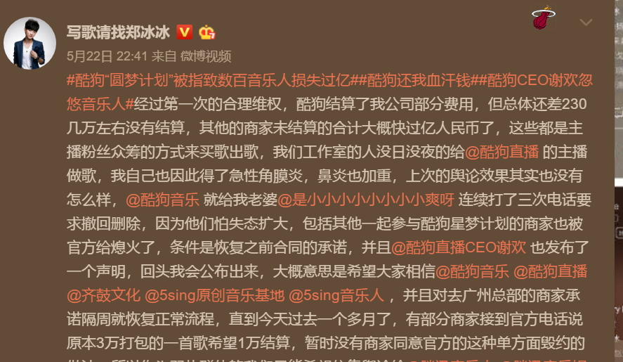 5月29日,据财经网、经济观察报、凤凰网财经、新浪科技等多家知名媒体报道,腾讯音乐旗下酷狗正在陷入一场巨额的合同纠纷。事件登上新浪热搜后,酷狗官方匆匆发布一份简短声明,但旋即遭到音乐人和主播等多方的驳斥。 报道指出:早在2018年,酷狗音乐在其直播平台举办了所谓的音乐人“圆梦计划”。活动由音乐制作人制作歌曲小样上传酷狗商城,经酷狗主播选择并购买后再录制成歌上线。但2019年3月8日,酷狗却突然通知25日将关闭交易,又在22日突然违约提前关闭交易服务,拖欠音乐人版权费等合理报酬,致使数百位音乐人损失过亿。 致音乐人损失过亿 匆匆声明不被认可 多家媒体报道后,5月29日下午,腾讯音乐旗下酷狗终于给出一份简短的回应,酷狗直播官微发布声明表示“接到了大量主播投诉,反映音乐质量不达标”。在这份简短的声明中,酷狗音乐并没有提及任何对音乐人损失的补偿举措,而声明中的说法也与此前酷狗直播CEO谢欢在公开信中“对遵守平台规则的优质歌曲正常结算发行”的承诺截然相反。同时,这一声明所述内容也立即遭到专业音乐制作人和主播在评论区的驳斥。 音乐人菜菜向北京商报记者表示,“酷狗直播一直都有审核,有审核通过的歌曲,也有审核失败发回来我们重新制作的歌曲。酷狗方在3月25日之前一直都在审核,并不是全部直接通过的。这是否说明酷狗审核机制不严格?如果如声明中所说,为什么质量差会审核通过?这是否是酷狗不买单的借口?”音乐人小雪指出,“如果歌曲质量不达标的话是无法通过的,既然能够正常上架就说明歌曲质量没有问题。而且这份声明也并没有对上架歌曲销量几十万却不支付版权费做出回应”。而5月30日中午,音乐人们更在微博直接曝光了酷狗此前认可商家审核标准的截图。 其实,早在事件爆发的半个月之前,音乐制作人郑冰冰就在微博控诉酷狗,拖欠其公司款项。5月22日,郑冰冰再次通过微博维权,表示酷狗音乐此前令其撤回删除维权文章,并同意归还欠款,但时至今日,迟迟没有兑现。郑冰冰还指出,由于酷狗音乐“圆梦计划”的违约及涉嫌“阴阳合同”,导致上百音乐人损失过亿。事件遭到曝光后,更多音乐人的艰难维权路引发了社会关注。音乐人宋女士在接受新浪科技的采访时就表示:“音乐平台帮助主播和音乐人圆梦,本该是一件皆大欢喜的事情,但未料到的是,这场‘圆梦计划’却成了让我难以释怀的梦魇。” 隶属音乐巨头腾讯音乐 酷狗曾屡次侵权音乐人 据悉,酷狗音乐、酷狗直播,和QQ音乐、酷我音乐等平台一样,都隶属于国内音乐巨头腾讯音乐。一直以来,酷狗等平台也屡屡对原创音乐人进行侵权。 面对酷狗的劣迹斑斑,2016年6月10日,豌豆荚、应用汇、同步推、移动MM等数十家软件应用市场,及OPPO、酷派、金立等名牌手机的应用商店,集体将酷狗音乐APP强制下架。2018年4月,因未经授权许可,侵权使用音著协管理的音乐作品,QQ音乐、酷我音乐和酷狗音乐更是接连被音著协诉至法院。 而就在今年湖南卫视播出的热门综艺节目《我是歌手》中,声入人心男团和迪玛希共同演唱了皇后乐队(Queen)的《Love of My Life》、《We Will Rock You》、《Bohemian Rhapsody》及《We Are The Champions》四首经典歌曲。在这些歌曲的版权管理方索雅音乐官方为发放任何授权许可的情况下,酷狗音乐、QQ音乐、酷我音乐却将这几首被侵权的歌曲全部上架自己平台。 由于长期侵权音乐人,甚至在腾讯音乐上市以后依然没有收敛,腾讯音乐及旗下酷狗“店大欺客”的形象,似乎已经早已印在了中国音乐的发展史上。而在中国音乐用户已经逐步认可音乐版权重要性的今天,酷狗一贯盗版侵权的态度很难让用户及音乐人、主播认可。酷狗音乐在危害音乐人权益的同时,也终将伤害用户的感情和平台自身的发展。目前,对于音乐人列举的事实,酷狗方面依然没有给出进一步回复。希望通过此次事件,酷狗能真正认识错误,承担起一家音乐平台该有的社会责任。 |
