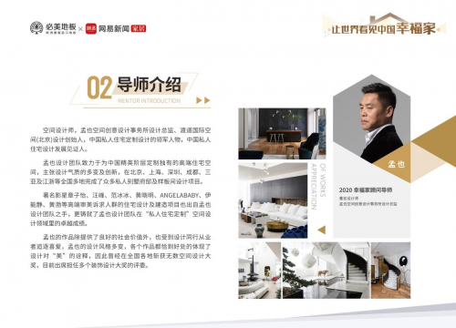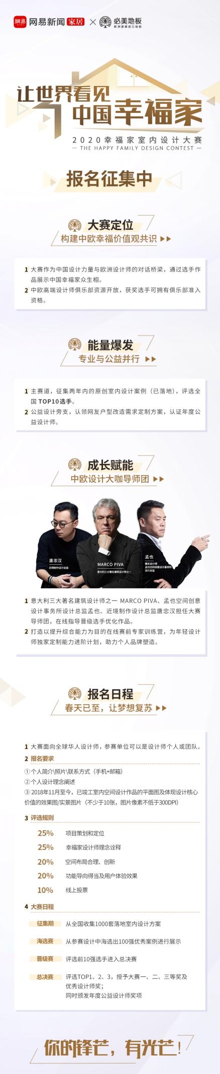 4月24日,2020必美地板&网易幸福家设计大赛正式启动!报名通道一开启,许多设计师和网友就快速地提交了自己的作品和改造需求,目前大赛处于全国火热海选中!无论你是才华横溢的设计师,还是受够了家装痛点的业主,都可以参与到我们的大赛当中,收获满满的幸福感! ![]() 01. 幸福家概念升级 幸福家设计大赛是必美地板自2015年起持续打造的大IP,以华人设计圈为核心,搭建全球设计圈的开放性媒体服务平台,通过一系列的交流碰撞,激发家居设计新潮流。6年以来,幸福家设计大赛为万千中国家庭提供了免费的户型改造方案,助力国人美好幸福生活的同时,也见证了中国设计师的快速成长。从1.0到6.0,幸福家不断升级版本。 ![]() 2020年,必美幸福家室内设计大赛以“让世界看见中国幸福家”为主题,邀请中欧设计界大咖为赛事助力,开展中国和欧洲设计师的对话,号召年轻设计师勇敢发声,唤醒设计正能量,推动中国设计力量在世界舞台上的爆发,展现中国幸福家众生相。 02. 幸福家赛制升级 大赛与往届最大的不同在于赛制方面,今年采用统一组别的大赛体系,面向设计师征集两年内完整的原创设计案例,最后评选TOP选手。另外继续保留公益设计初心,增设“公益改造”支线,参赛设计师通过认领网友的改造需求,一对一定制改造案例,将有机会跃升年度公益设计师。设计师选手可以选择两项都参与,或者择一参赛。 ![]() ![]() 03. 幸福家导师扩容 作为大赛的关键所在,必美地板今年力邀中欧设计界的老炮儿担纲大赛导师,既有去年的态度老将,意大利三大著名建筑设计师之一的Marco Piva(马克.皮瓦)、孟也空间创意设计事务所设计总监孟也,也增加了“新面孔”——近境制作设计总监唐忠汉,三大灵魂人物全程全力输出设计精华,为选手指点迷津,助力年轻设计师成长。 ![]() ![]() ![]() 04.「易起幸福」设计公开课 为更好地赋能新生代设计师,让设计师走向更广阔的世界舞台,2020幸福家室内设计大赛期间,必美联合网易打造以“提升设计师综合能力”为目的在线赛前专家训练营——“易起幸福”设计公开课,邀约设计大咖、设计行业资深媒体人、品牌营销资深大拿等人群,从专业设计能力提升、设计师个人IP塑造、年轻用户需求洞察等角度,为年轻设计师独家定制能力进阶计划。网易将充分发挥媒体资源优势,通过网易设计师库沉淀大赛案例,针对优秀设计师开展线上包装推广,助力设计师个人品牌养成。 5.20 「易起幸福」设计公开课第一站孟也直播开课 6.17 「易起幸福」设计公开课第二站青山周平扬州开课 7月 「易起幸福」设计公开课第三站神秘大咖直播开课 8月 「易起幸福」设计公开课第四站唐忠汉直播开课 ![]() 05.大赛 报名方式 ![]() |