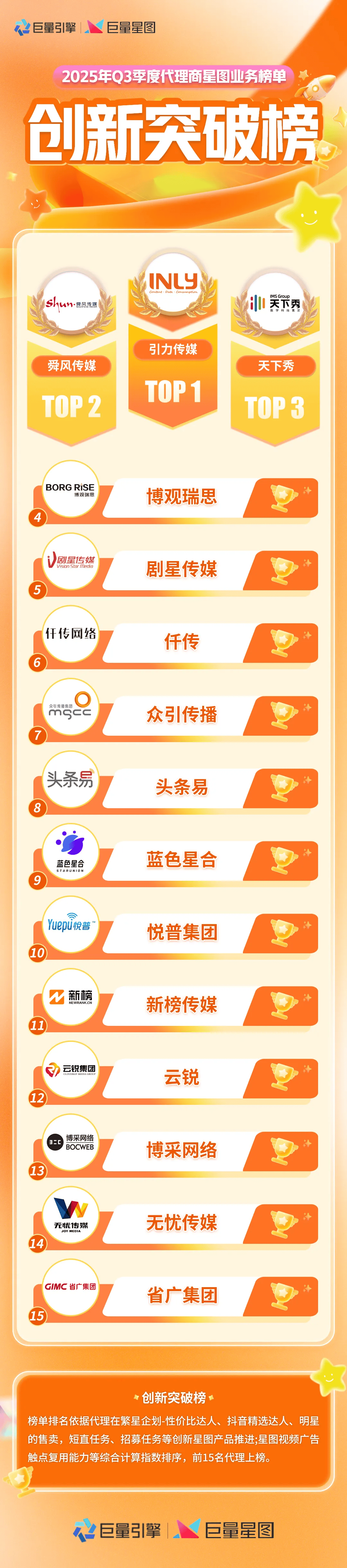 巨量引擎代理商星图业务 2025年Q3季度 榜单荣耀揭晓!持续聚焦行业深耕、创新突破、拓新增长 三大核心维度,更精准锚定市场趋势 ,全方位呈现星图业务代理商在 Q3季度 的硬核实力与增长潜能。 行业先锋榜:锚定五大赛道,细分行业领航者 行业先锋榜精准聚焦美妆、日化母婴、食品饮料、3C及电器、汽车 五大核心赛道,完成对市场关键阵地的精准覆盖。上榜代理商凭借在各领域客户深耕数量、市场规模占比、行业增长速率、内容营销效能 等核心指标的卓越表现,定义细分市场的服务标准。 ![]() ![]() 创新突破榜:聚焦达人价值,引领业务新生态 创新突破榜单新增繁星企划-性价比达人、抖音精选达人团 两大指标,精准呼应当前市场对 “精准触达” 与 “成本优化” 的双重需求。同步保留考核创新产品推进、星广高效融合,全面衡量代理商创新运用能力,服务创新是助力代理商从 “服务方” 升级为 “增长伙伴” 的关键动能。 ![]() ![]() 星势开拓榜:迸发增长潜能,解锁市场新空间 榜单聚焦 “拓客增速 + 营收增量” 双核心,通过服务客户数量环比增速与增量、星图结算金额环比增速与增量 两大维度,筛选出在 Q3季度 实现市场突围的成长型代理商。 ![]() ![]() 2025年Q3季度星图代理商榜单的发布,通过 “行业先锋 — 创新突破 — 星势开拓” 的三维评价体系,立体描绘出达人营销行业的发展全景:行业先锋榜夯实生态根基,创新突破榜引领进化方向,星势开拓榜激活增长动能。这三大榜单不仅是对上榜机构的权威认证,更形成了 “夯实基础 — 创新迭代 — 规模增长” 的行业发展指南,为星图代理生态的健康发展注入持续动力。 |
