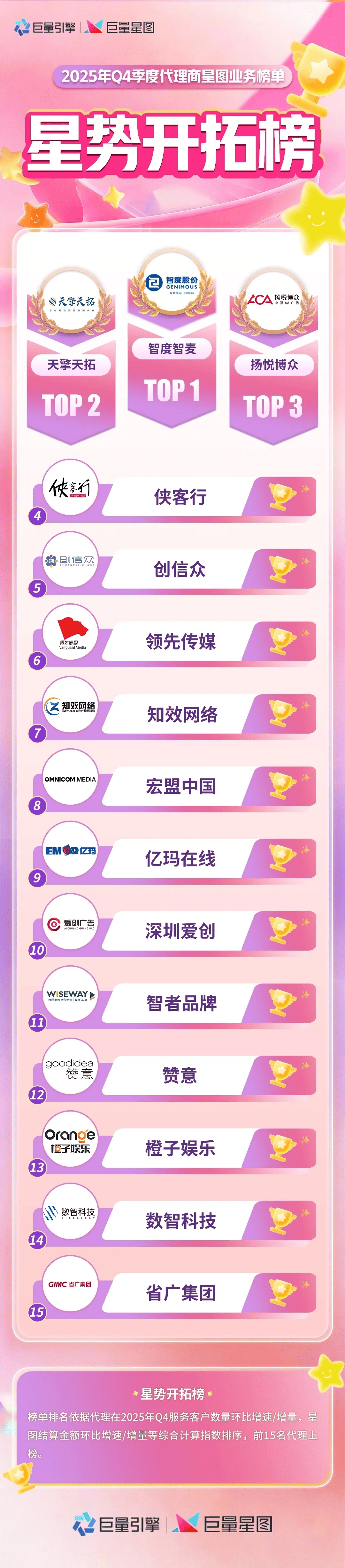 时光荏苒,2025 年无数代理商伙伴与巨量引擎携手同行,以专业实力深耕行业,以创新思维突破边界,用一个个亮眼成绩勾勒出达人营销的蓬勃图景。今日,2025 Q4 季度星图代理商榜单正式揭晓,三大榜单重磅落地,既是对全年奋斗的总结表彰,更是对未来征程的蓄力启航! 行业先锋榜:垂直深耕,铸就领域标杆作为达人业务的核心榜单,行业先锋榜延续从行业活客、业务规模、行业增速、内容营销质量四大核心维度综合考评,在五大垂直领域各评选出 10 家代理商。每一位上榜者都是垂直领域的实力标杆,用持续的深耕与专业的服务,诠释了 "聚焦方能极致" 的行业真理。