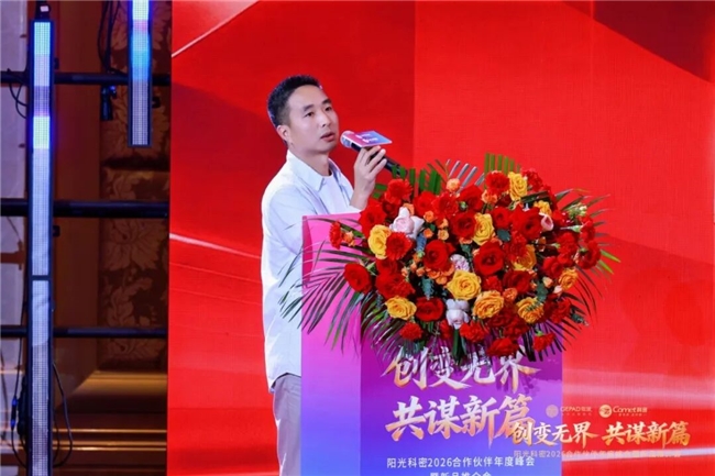 杨宝江先生发言 长沙拓美智能科技有限公司的廖明胜先生则作为卓越合作伙伴的代表发言。他用“相信”和“坚持”这两个词,概括和分享了过去10多年与科密结缘的心得体会,并表示,将继续专注于阳光科密的产品,努力坚持做好市场。