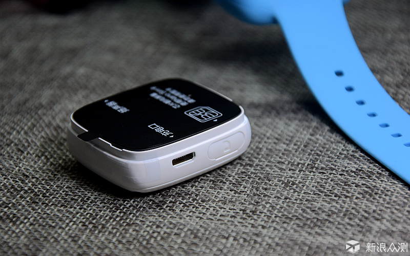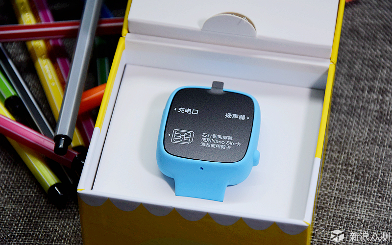 ![]() 掀开上盖,360儿童手表呈现眼前,表面被一张示意贴纸所覆盖,上面详细标注了手表的各接口的位置。左边为充电接口、手机卡卡槽,也能了解到使用的是nano sim卡,右边则为外放扬声器、电源开关按钮。