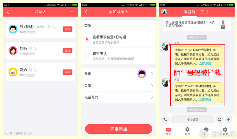 APP软件上的操作笔者就不做“人工说明书”了,设置其实很简单,会使用智能机的用户都没有困难的。我们还是着重了解下360儿童的几个功能,看看他到底是如何保护孩子安全的。当然打电话功能这是必须的啦,软件设置里,必须将需要通话的家庭成员的电话号码,通过APP存入手表的“联系人”中,这样才能打结电话,没在“联系人”中的电话号码,手表会拦截来电,避免骚扰。
