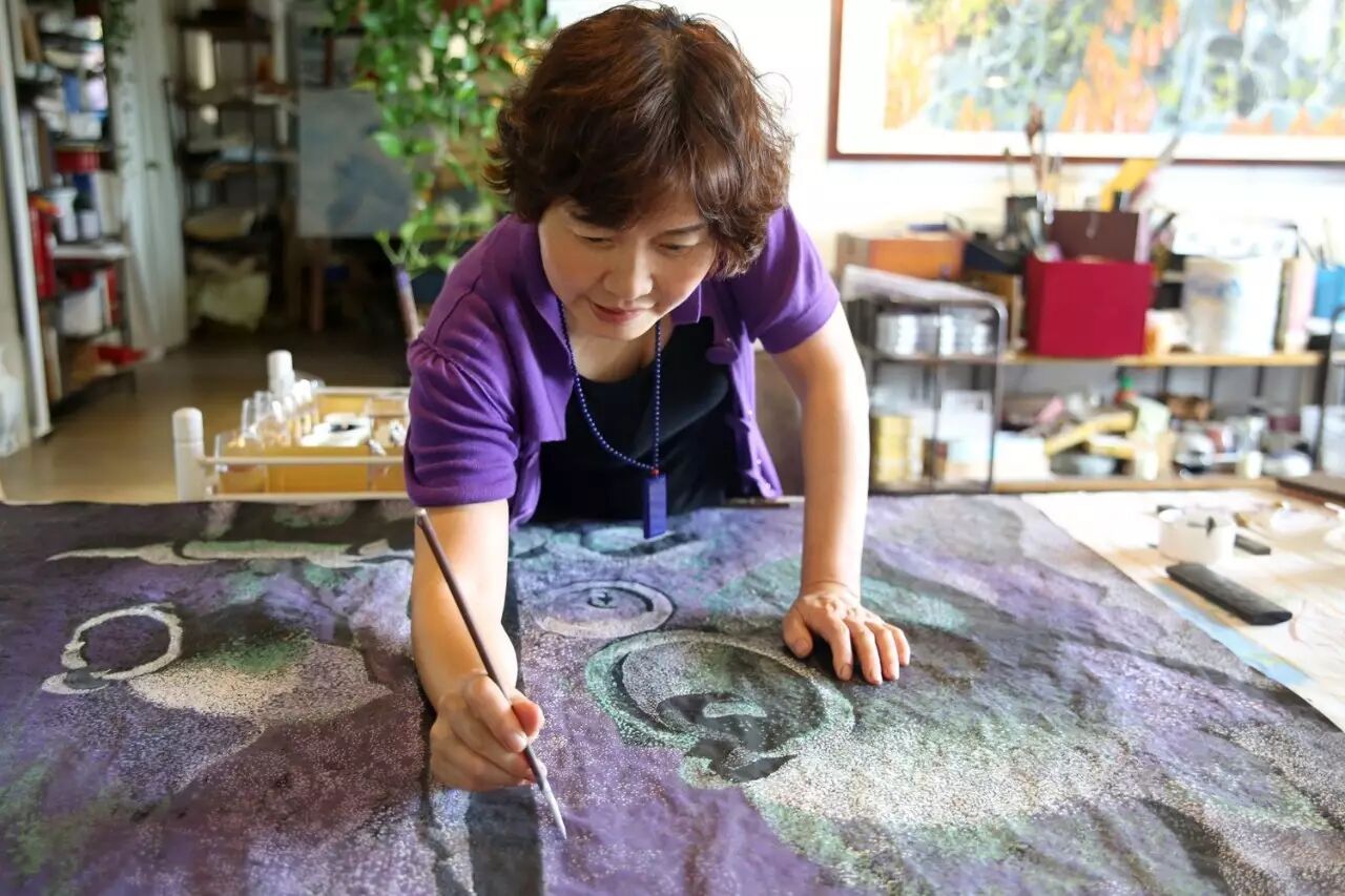 画意第三重:听门。听到的是大道之音。张健的“门”系列画作,可谓是前无古人。她画门的灵感来自于——《论语·雍也》:“谁能出不由门?”在张健看来,门承载的是“入必由之,出必由之”的生命哲学,得到与失道之间的刹那永恒,“一脚门里一脚门外”的辩证之法。也因此,她的“门”系列作品,看似随意的空间分割、领域标志、等级划分、身份表达等,总能让人不由自主地感悟人类文明的进程,思索人生的终极价值与意义。 美术家张健作品(听门系列) 画意第四重:听禅。听的是修行。正谓“月亦非禅,听亦非禅,过程才是禅”。张健的禅意作品吸取印度、龟兹、波斯等地区的艺术元素,色彩深沉厚重,线条细致而流畅,用写实传神的笔触,既传播给大众真、善、美,又映照出当代的人文情怀。 美术家张健作品(听禅系列) 画意第五重:听佛。听到的是生命。张健的佛作,典型的是取材于西域圣境敦煌壁画的系列画作,她擅长描写不同人物的不同神态与动势,善于突现人物及各种场景中的生命律动,用画面造就出中国文人和广大民众梦幻中的人间佛境。而她笔下的罗汉、高僧、达摩、佛祖均呈现安详、自在的庄严相貌,观之“洗涤心中阴霾”,思之“净化世相磁场”。